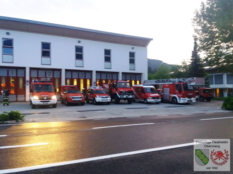 Ab 19:45 Uhr werden die beteiligten Feuerwehren über Funk alarmiert und auf den Weg beordert. Ab 19:58 Uhr wird am Übungsobjekt von den eintreffenden Feuerwehren im 1. Einsatzabschnitt die Brandbekämpfung durchgeführt. Dazu werden 2 Tanklöschfahrzeuge und die Drehleiter Oberolang in Stellung gebracht.
