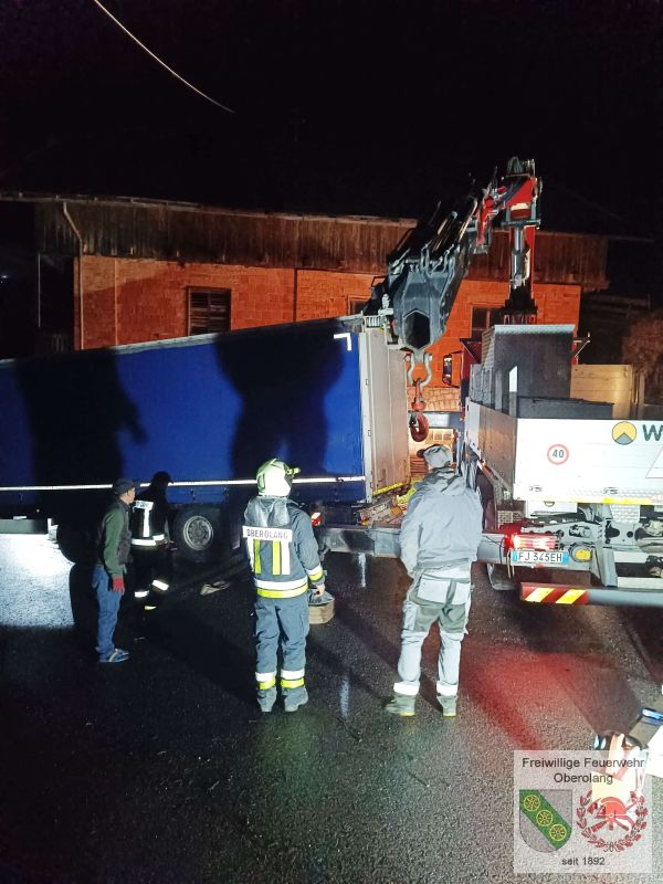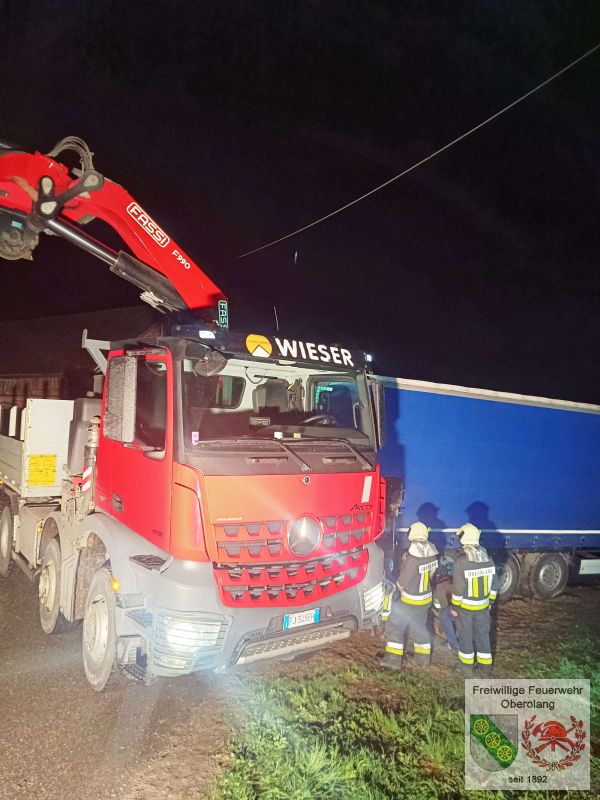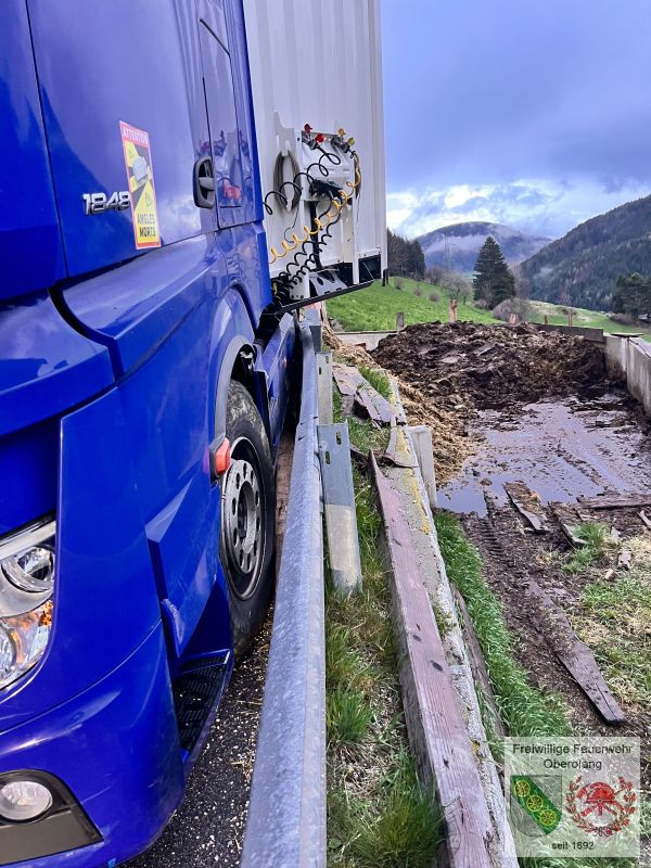 Am Donnerstag, den 17.04.2025, wird die Freiwillige Feuerwehr Oberolang um 19:43 Uhr über die Landesnotrufzentrale mittels Personenrufempfänger zu einem Einsatz der Alarmstufe 4 gerufen. Bei der Hofstelle Steiner auf der Goste ist ein Sattelzug hängen geblieben. Auf Grund falscher Navigation ist der LKW auf die für ihn ungeeignete und gesperrte Goste-Straße geraten. Beim Versuch den Sattelzug zu wenden, ist er schießlich an einer Engstelle hängen geblieben, sodass der LKW weder Vorwärts noch Rückwärts weiterfahren kann.