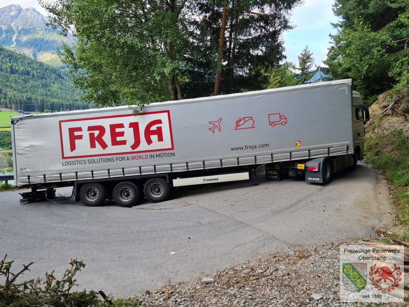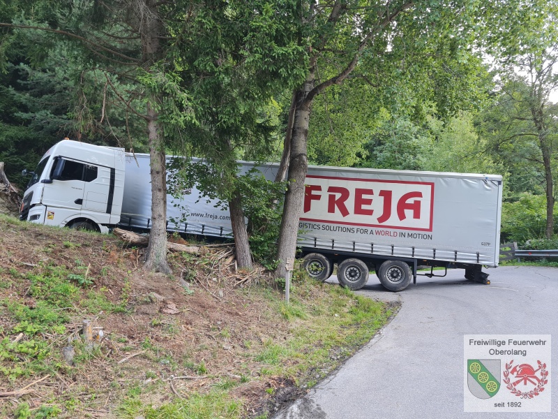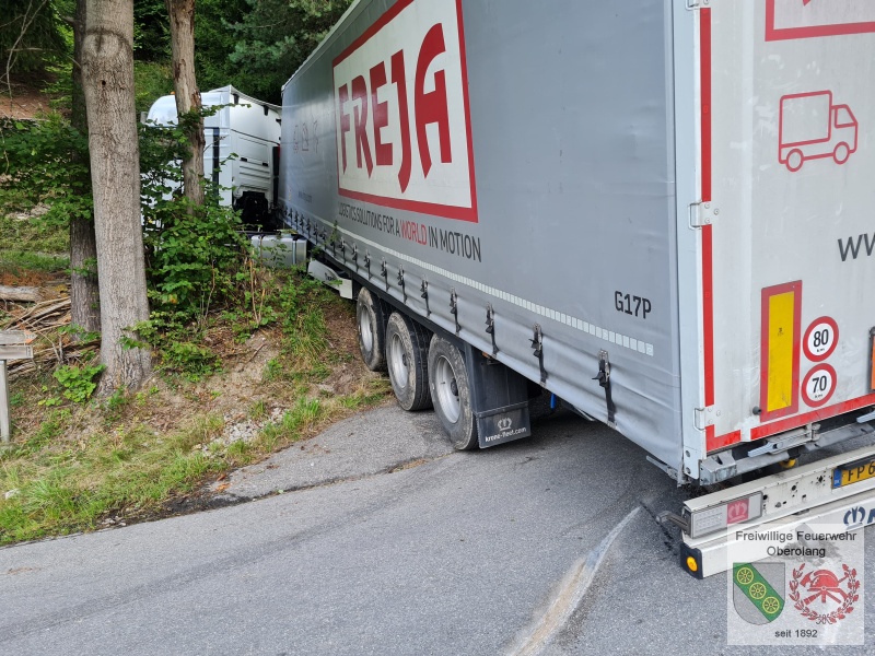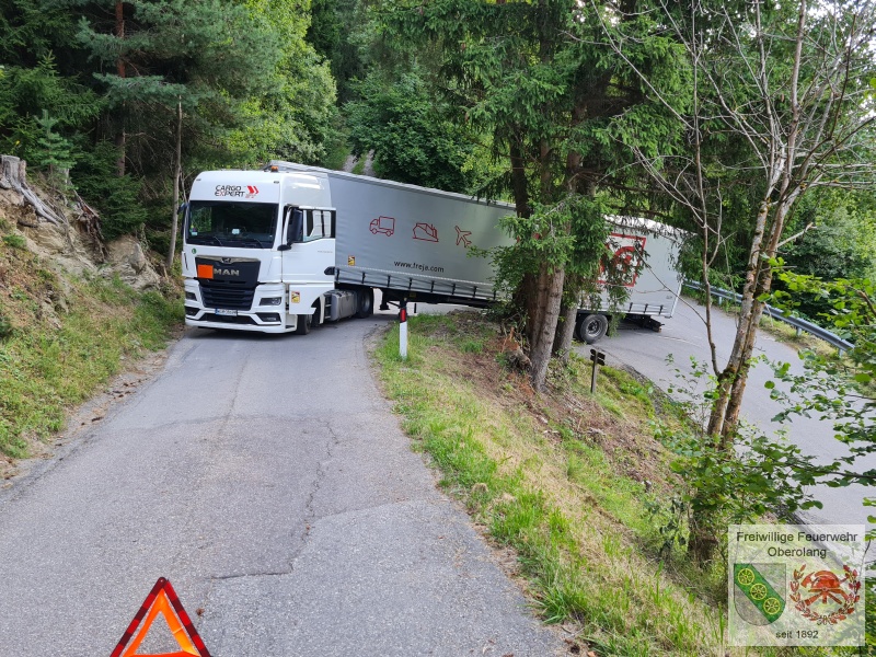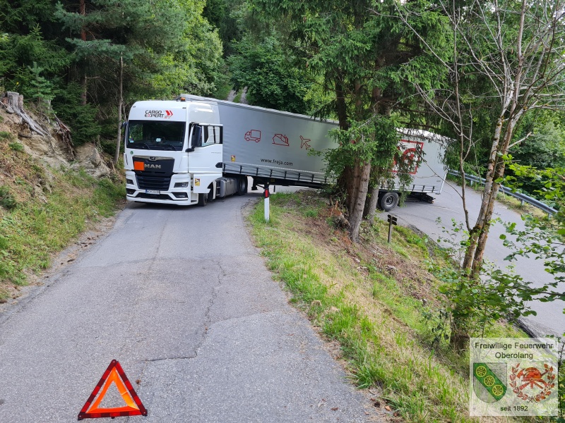 Am Donnerstag, den 31.07.2025, wird die Freiwillige Feuerwehr Oberolang um 16:27 Uhr über die Landesnotrufzentrale mittels Personenrufempfänger zu einem Einsatz der Alarmstufe 4 gerufen. In der Kehre nach der Hofstelle Steiner auf der Gemeindestraße Goste ist ein Sattelzug hängen geblieben. Auf Grund falscher Navigation ist der LKW auf die für ihn ungeeignete und gesperrte Goste-Straße geraten. Beim Versuch dennoch die Engstelle der Kehre zu passieren, ist der Sattelzug hängen geblieben, sodass der LKW weder Vorwärts noch Rückwärts weiterfahren kann.