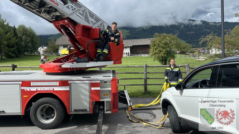 Die ausgerückten Wehrmänner heben den PKW mit Hilfe der Drehleiter an und können ihn, möglichst schonend, wieder zurück auf die Fahrbahn stellen. Der PKW-Lenker kann anschließend seine Fahrt fortsetzen; am Fahrzeug entstehen keine Schäden. Nach verrichteter Arbeit rücken wir wieder ins Gerätehaus ein.