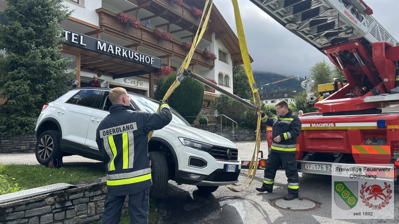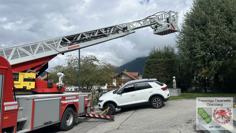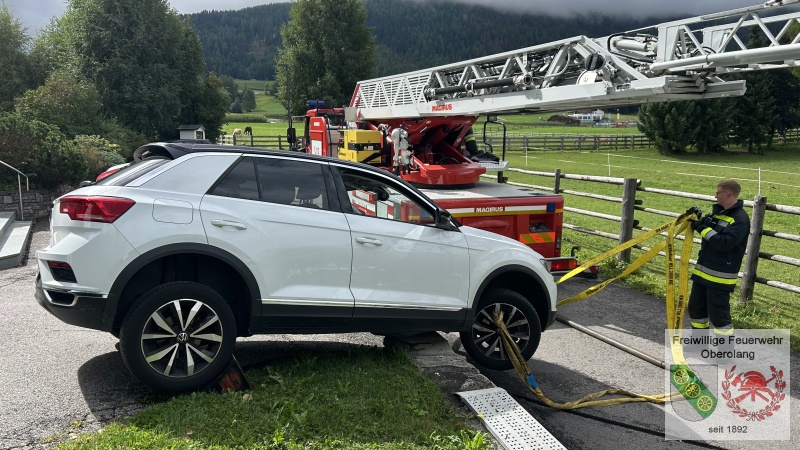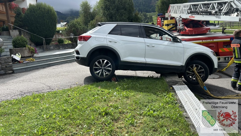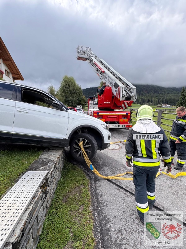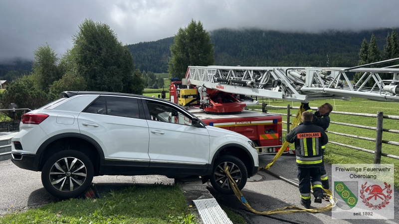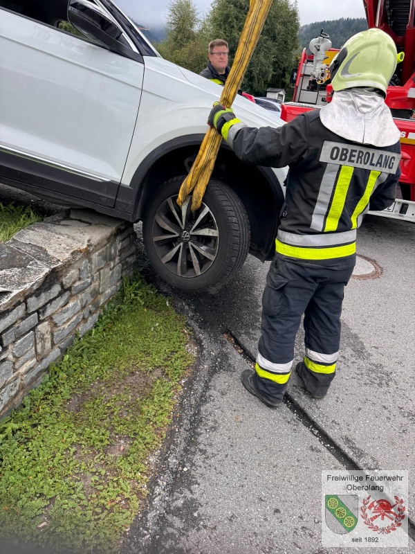 Am Freitag, den 29.08.2025, wird die Freiwillige Feuerwehr Oberolang um 10:28 Uhr telefonisch zu einem Einsatz der Alarmstufe 4 gerufen. Ein PKW ist auf Grund eines Missgeschickes bei der Einfahrt zum Parkplatz über die Fahbahn hinaus geraten und auf einer Stützmauer hängen geblieben bzw. auf der Stützmauer aufgesessen.