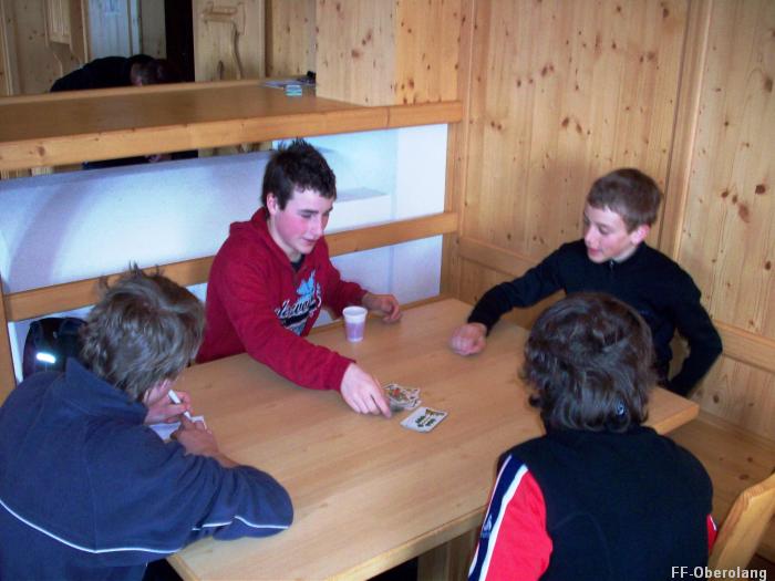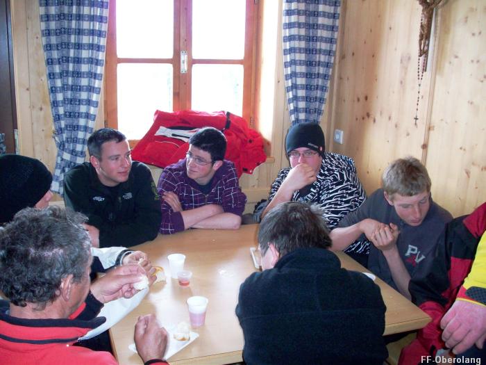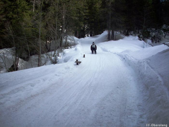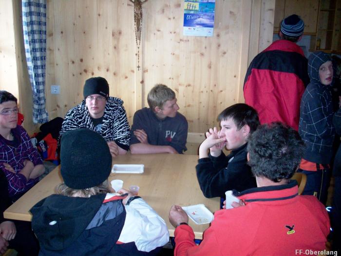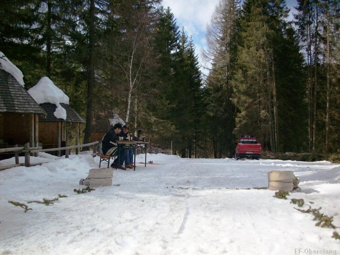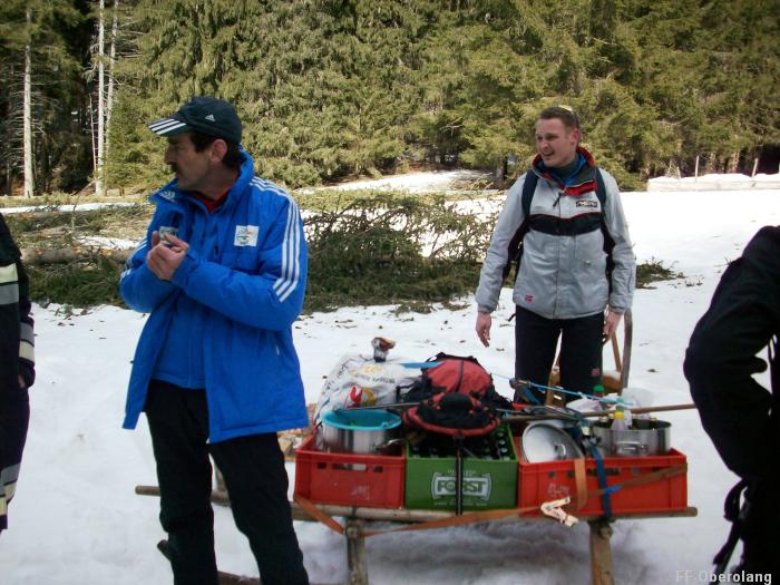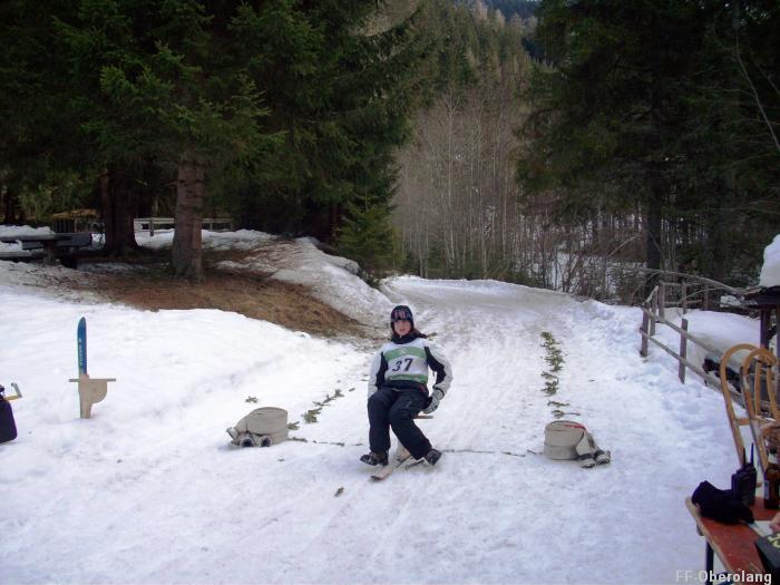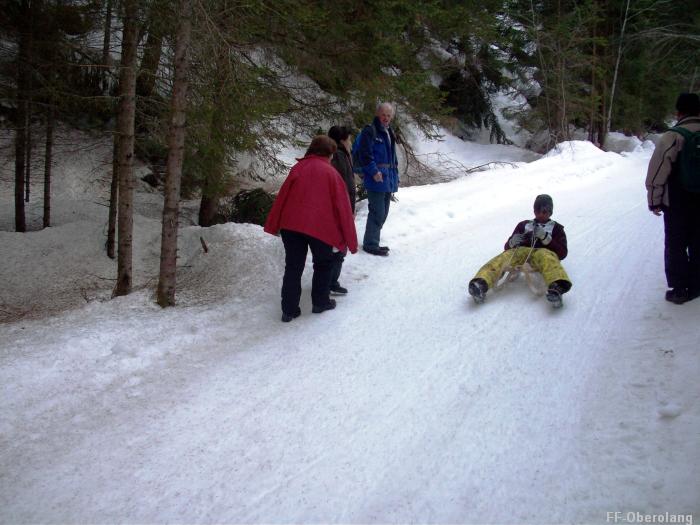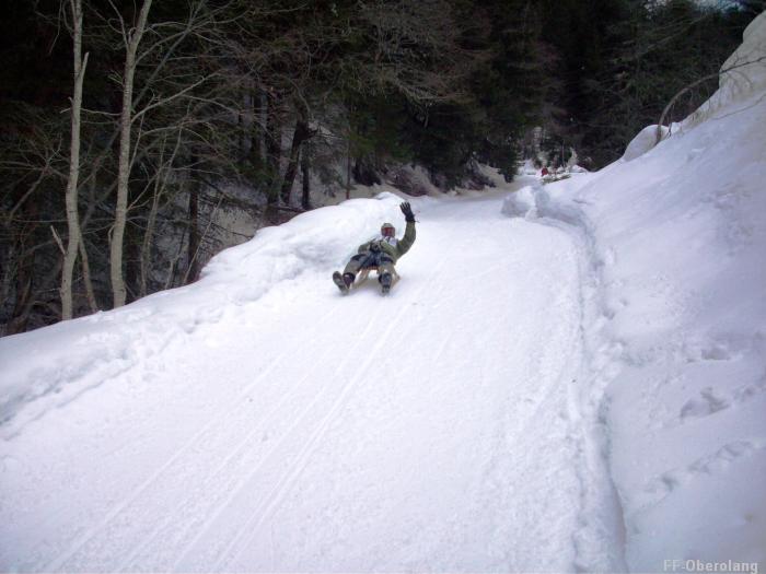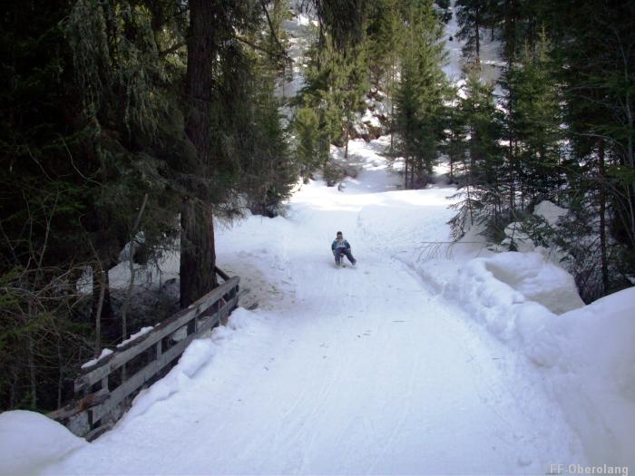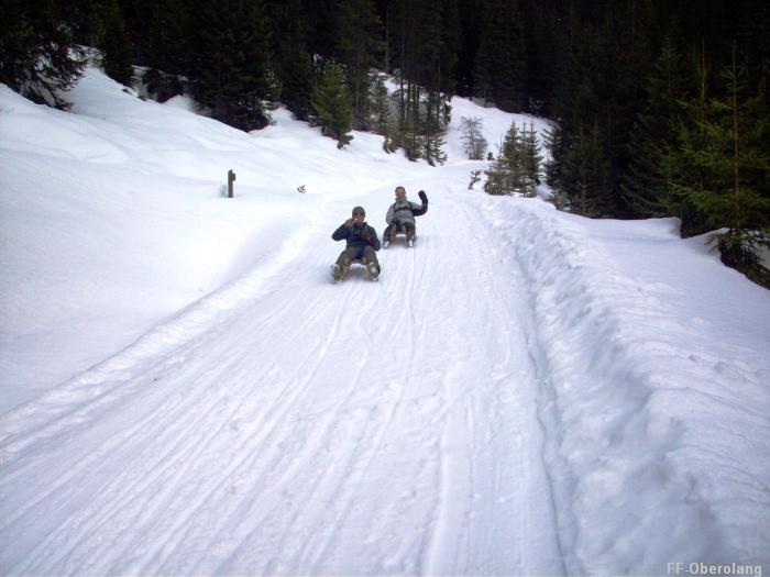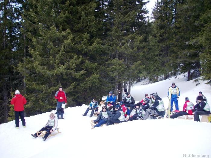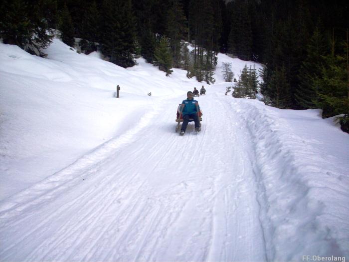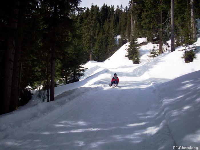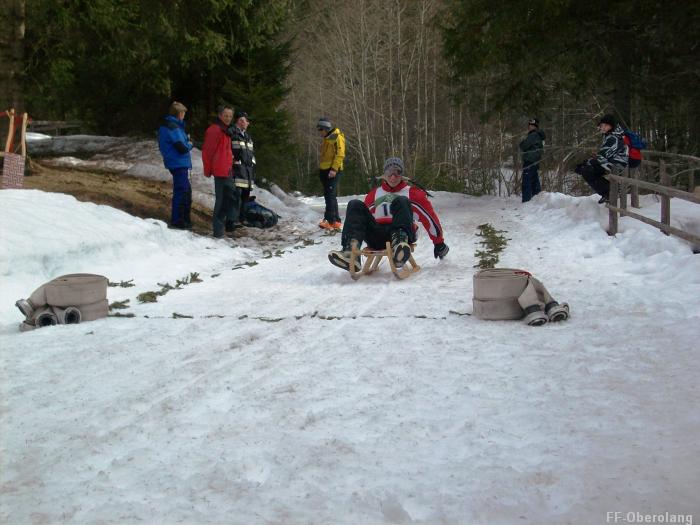 Gegen 12:00 Uhr treffen alle Jugendgruppen in der Brunsthütte ein und es wird ein be-scheidenes, aber doch sehr schmackhaftes Mittagessen gereicht, das von einigen Hel-fern unserer Wehr vorbereitet worden ist. Nach dem Essen wird noch etwas Karten ge-spielt oder einfach der schöne Tag genossen. Gegen 14:00 Uhr erfolgt der Start zum Ro-delrennen nach Richtzeit, es gilt also nicht zu schnell zu fahren und mit Glück die Strecke in der Richtzeit zu bewältigen. Gestartet wird im Minutenabstand und die Laufzeiten sind im Mittel um die 12-13 Minuten, was etwas ungewöhnlich ist für ein Rodelrennen. Auch deshalb ergeben sich einige lustige Szenen bei der Abfahrt, bei denen sich die jeweiligen Jugendbetreuer, die als Streckenposten für Sicherheit sorgen, sehr amüsieren.